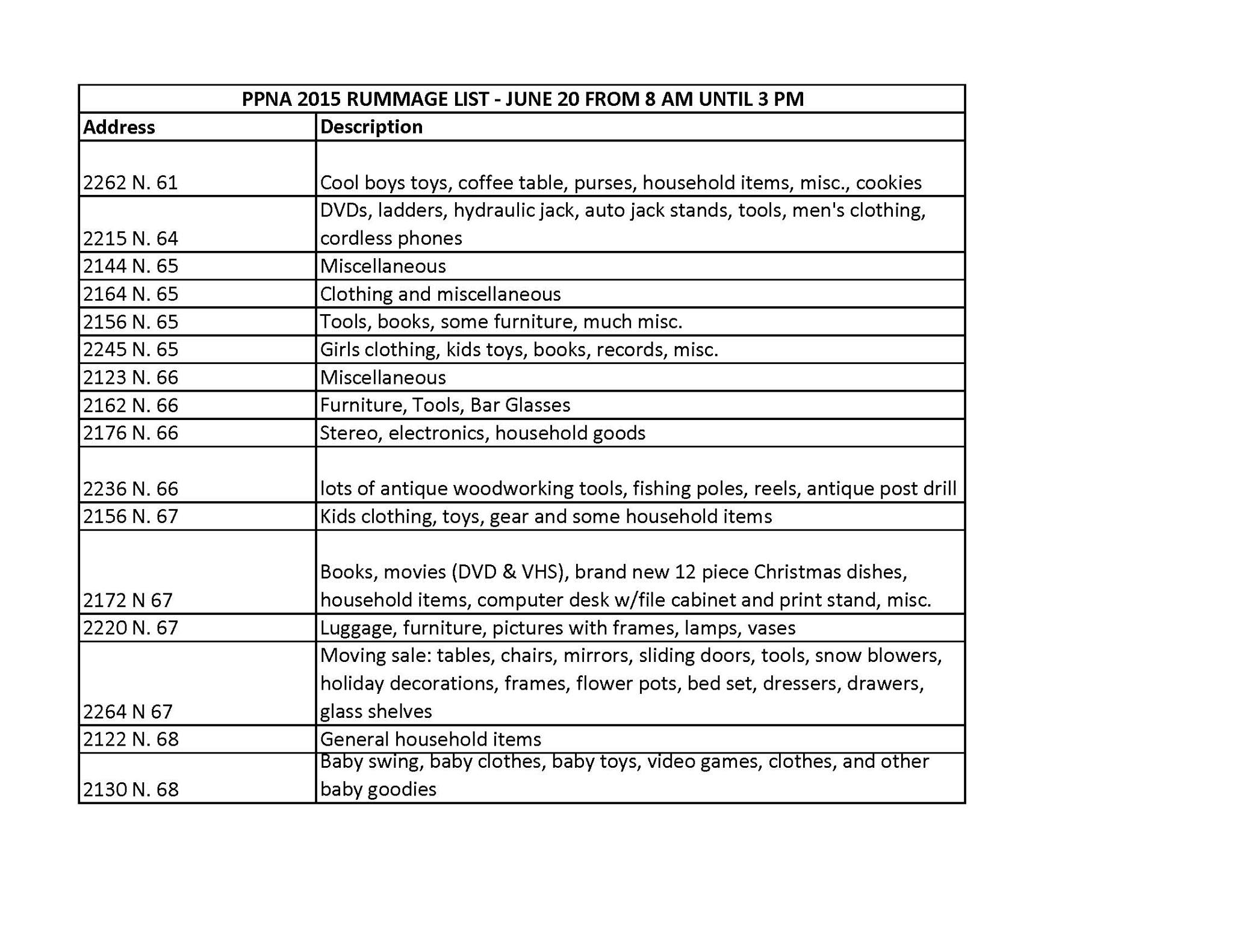 Posted on June 11, 2015June 14, 2015 in News Neighborhood Wide Rummage Sale Pabst Park is hosting a neighborhood wide rummage on Saturday, June 20th, from 8am-3pm. Here are the participants from 60th to 68th Street between North Ave and Lloyd St. Paper copies of the list will be available from participants. Happy Shopping!