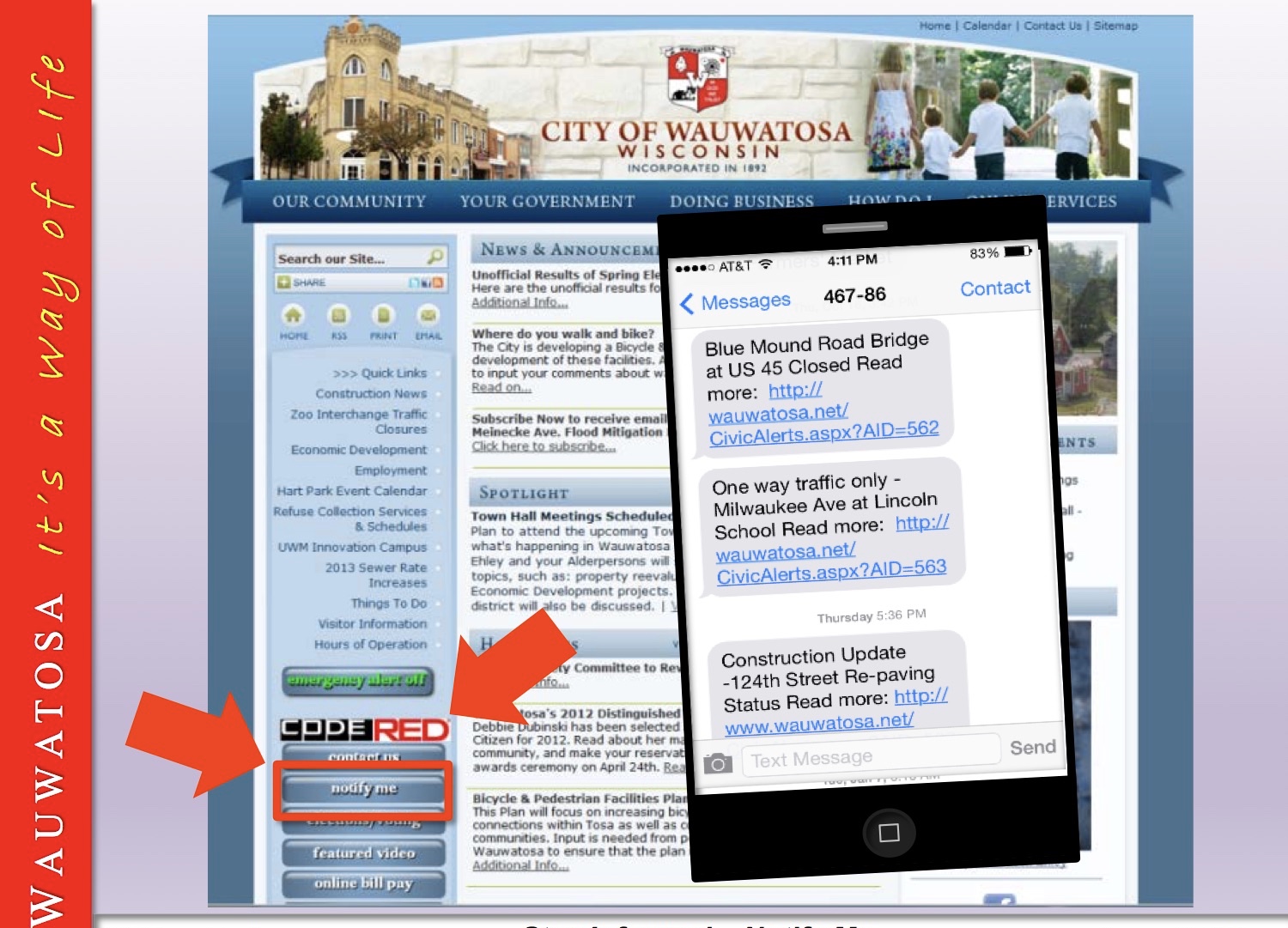 Don’t want to be surprised about issues and events happening in Tosa? Utilize the city’s NOTIFY ME program on their website to receive email or text notices about areas of interest. You can select the categories you would like to receive notifications for, including, community events, construction, specific city projects and other hot topics. You can also register for CODE RED alerts. Visit www.wauwatosa.net to subscribe.