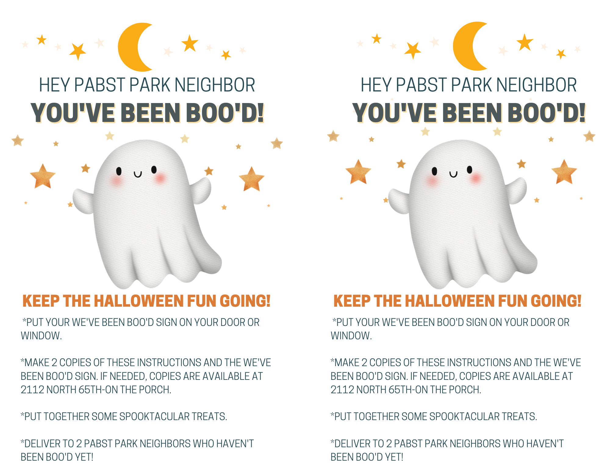 Posted on September 22, 2022October 12, 2022 in Events, News, Volunteer Opportunities Boo a Pabst Park Neighbor Surprise a neighbor with a fun Halloween treat! Here’s the instructions and signage for you to play along! Related