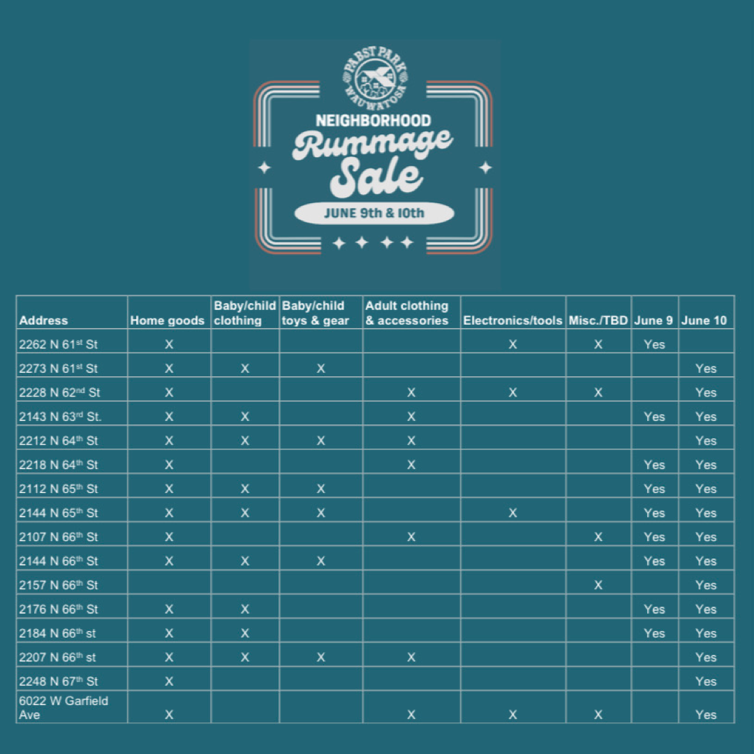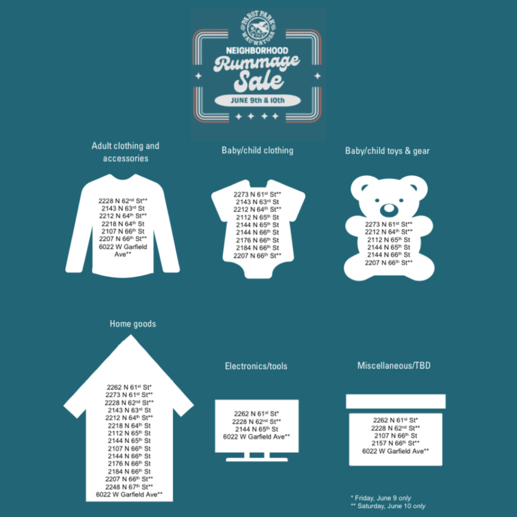 Look for the snazzy rummage signs from our business sponsor, The Benson Group and neighbor Tom Telderer, marking participants. Shout out also to neighbor Bri for creating our fun listing of participants.