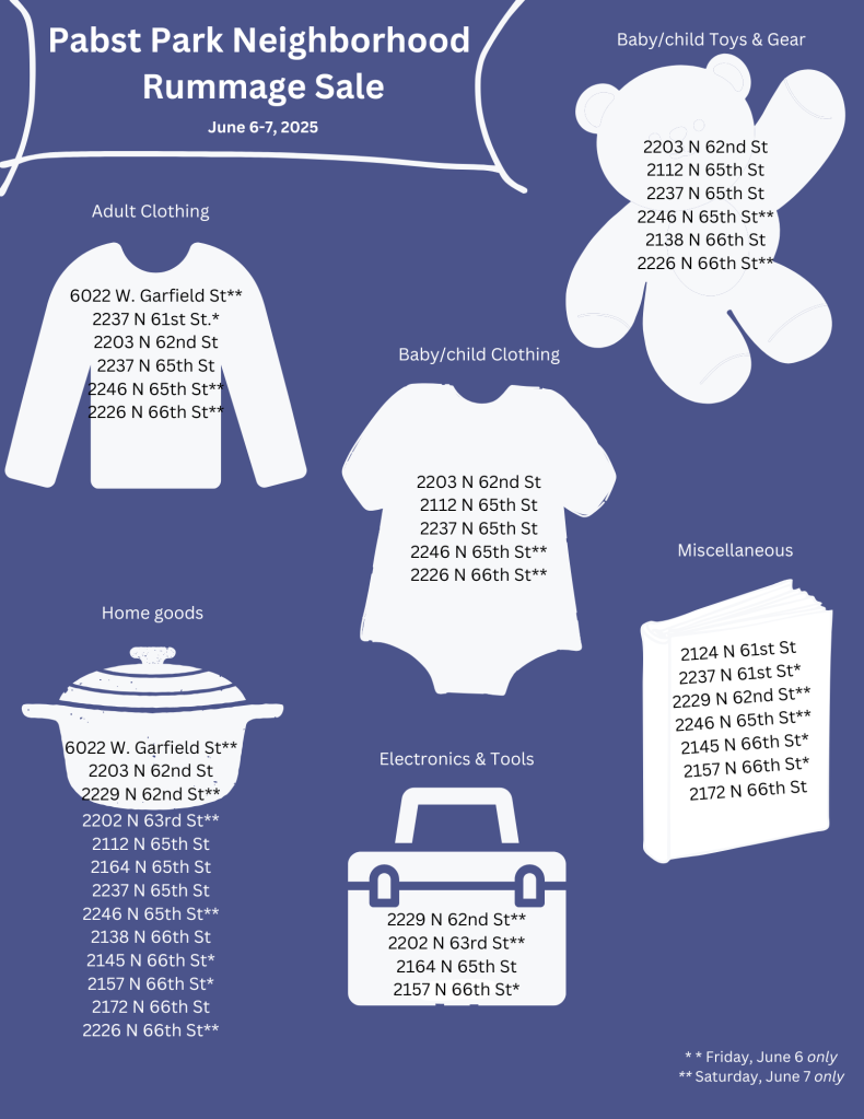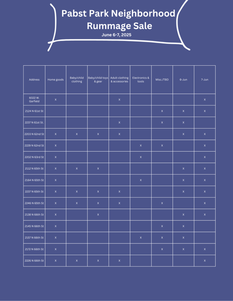 Neighbors can participate in the rummage sale on either June 6th or 7th, or on both days, anytime between 8 AM and 4 PM! While you are welcome to host a rummage sale on these days, please note that we have closed our registration form for new participants in order to publish the master list online. No new addresses will be added, but there will still be plenty of traffic in the neighborhood if you wish to join in!